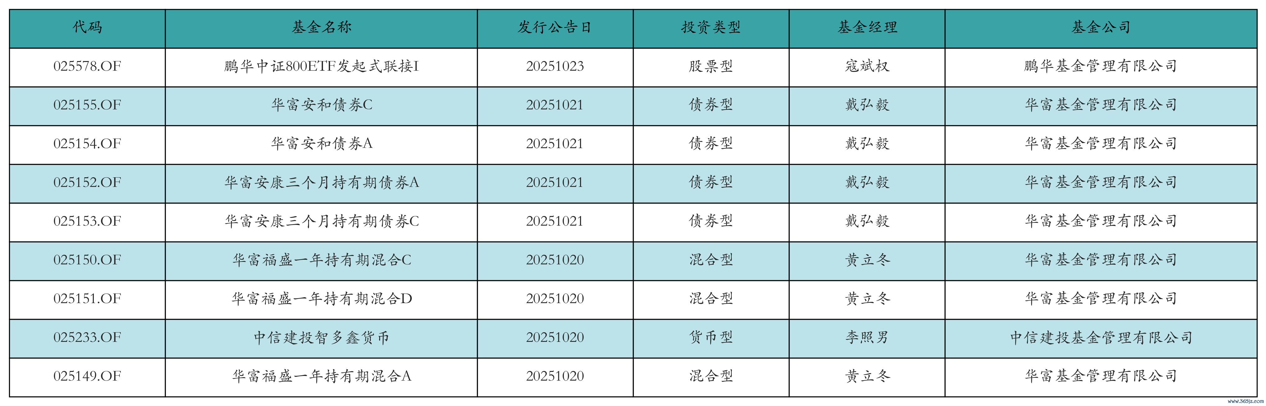 上周有9只新基金发行,分别为:鹏华中证800ETF发起式联接I、华富安和债券C、华富安和债券A、华富安康三个月持有期债券A、华富安康三个月持有期债券C、华富福盛一年持有期混合C、华富福盛一年持有期混合D、中信建投智多鑫货币、华富福盛一年持有期混合A,详情见下表: