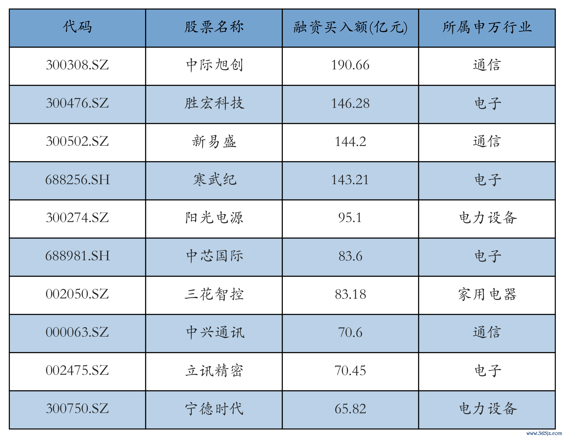 上周两市共有3457只个股有融资资金买入,共有143只个股买入金额超10亿元,其中中际旭创、胜宏科技、新易盛排名前三,买入金额分别190.66亿元、146.28亿元、144.2亿元。融资买入额前10个股详情见下表: